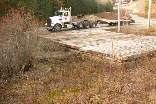 Large truck hauling flatbed on wetland matting and road in ROW.