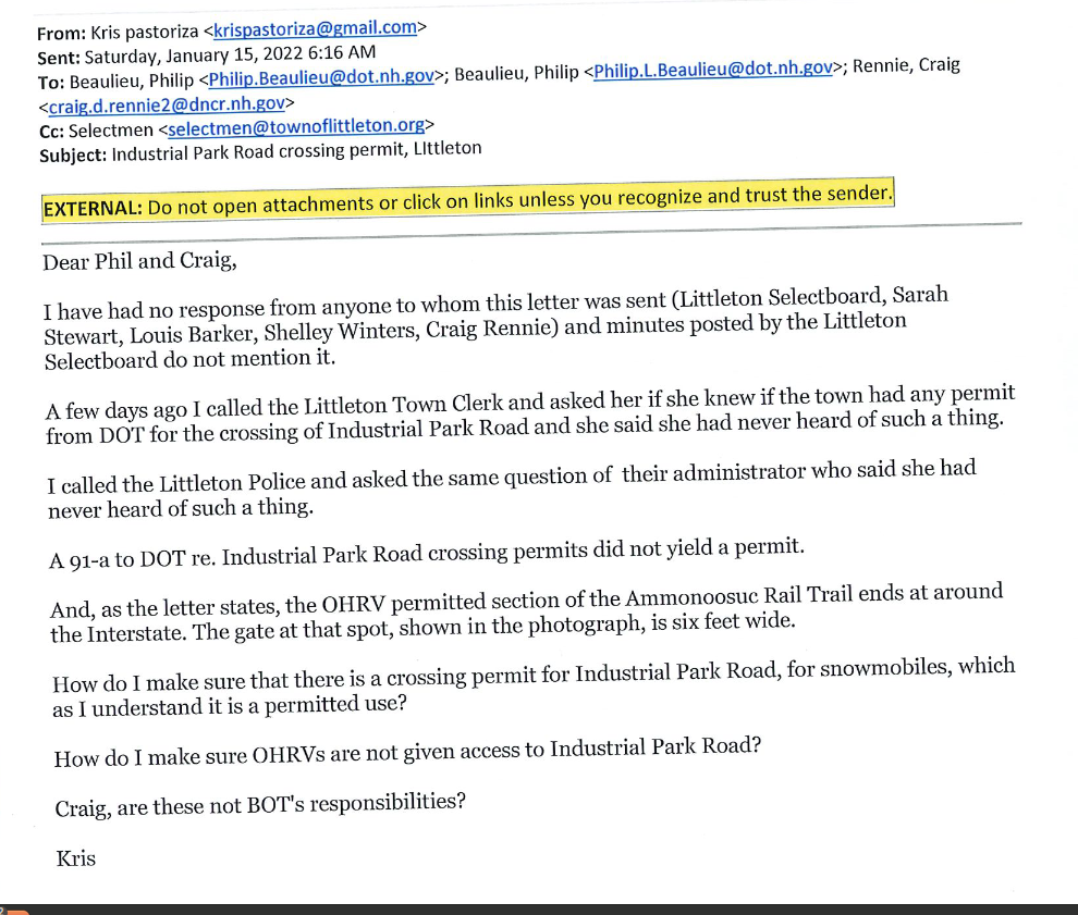 February 3, 2022, letter to Board of Trails, DNCR, FHWA and Town of Littleton: "The Ammonoosuc Rail Trail (non-TE funded section) does not end at Industrial Park Rd. DNCR has known this since at least 2017."