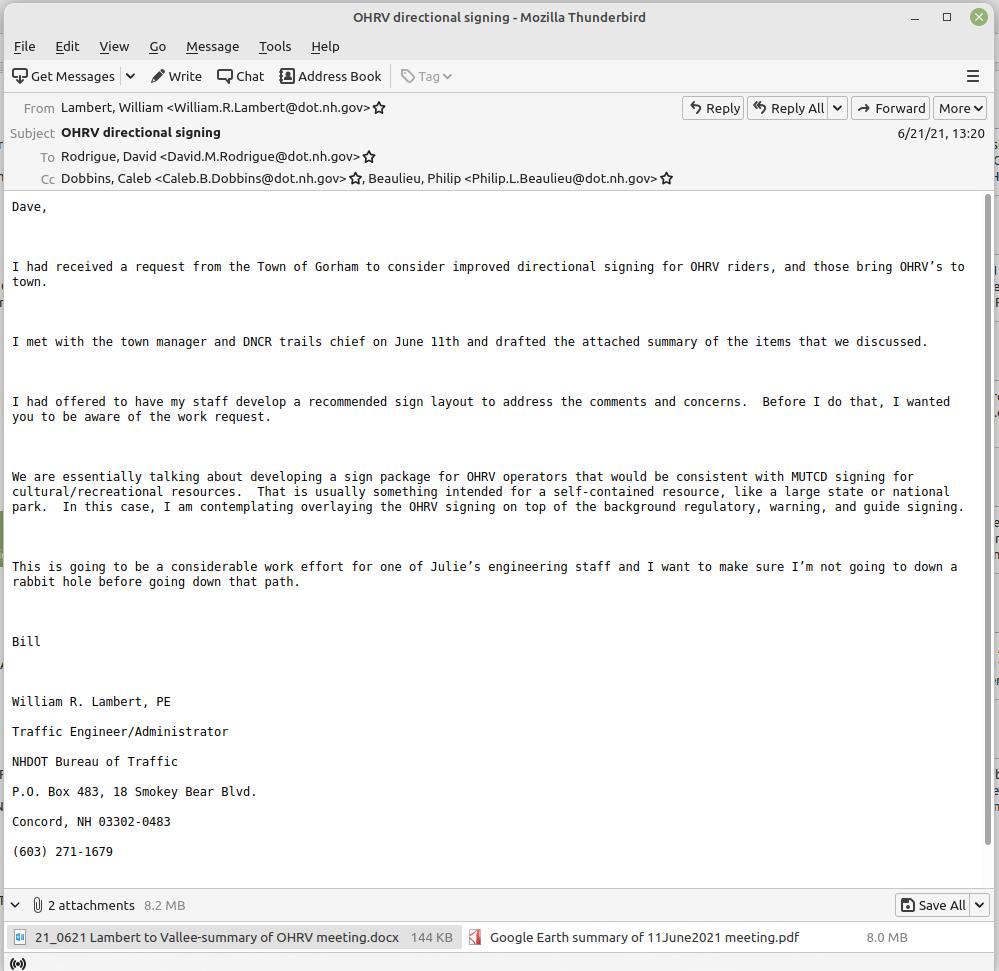 2020, November, HB 1182 meeting: Committee to Study on road use of non-traditional motor vehicles. dN 20201, June, DOT to OHRV riders/DNCR re. signs needed on Routes 2 and 16, Gorham.