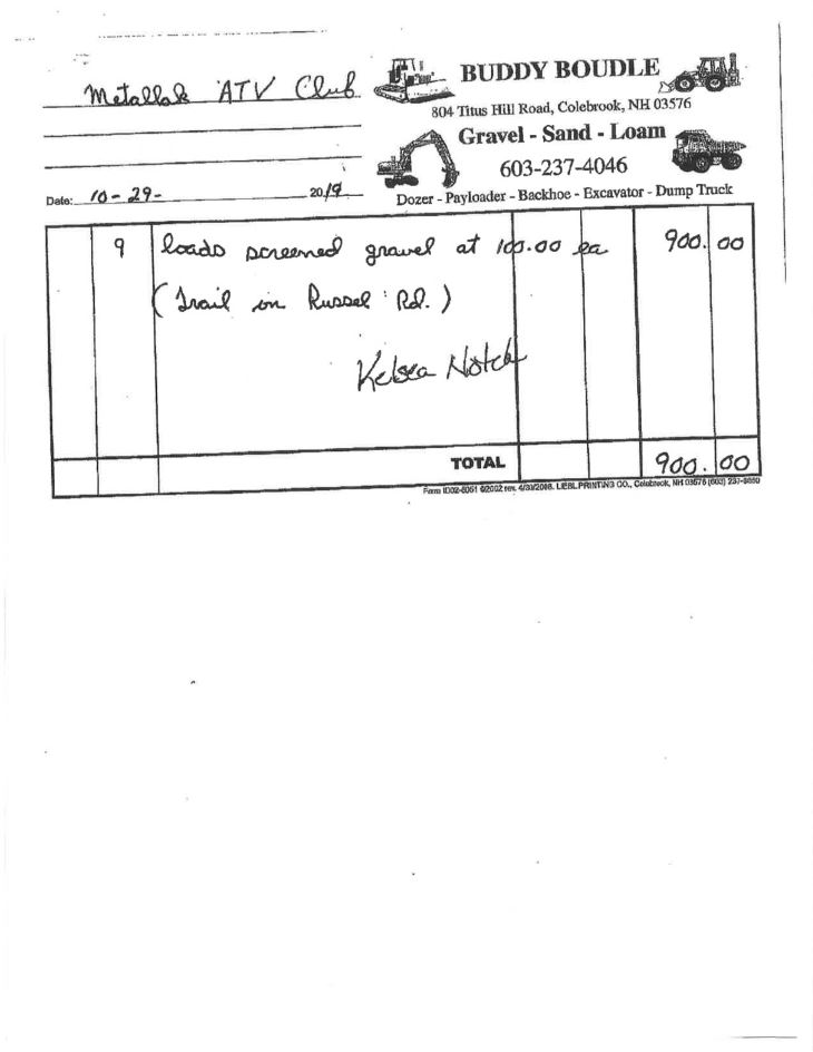 Kelsey Notch excavator work Metallak ATV Club $2530. 2017