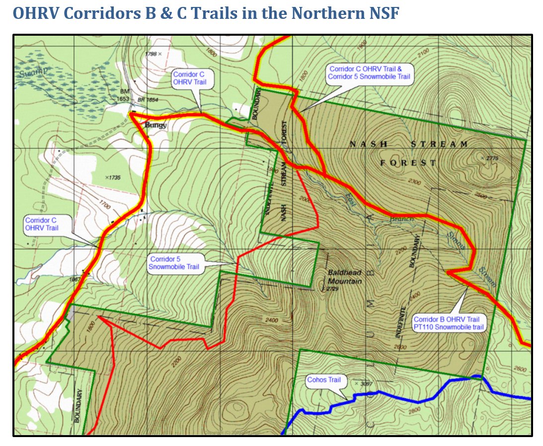 Road, trail and stream footprints submitted to Patrick Hackley by Larry Gomes of Great North Woods ATV Club; no noise footprint, light-pollution footprint, effect of noise on wildlife footprint, herbicide footprint, sedimentation effects on streams, invertebrates and fish footprint, pollution footprint, carbon footprint of ATV trail use and maintenance, fragmentation by roads and trails footprint, damage footprint beyond Nash Stream State Forest caused by ATV access through the Forest.