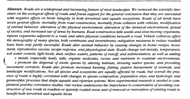 1999: "Roads of all kinds have seven general effects; mortality from road construction, mortality from collission with vehicles, modification of animal behavior, alteration of the physical environment, alteration of the chemical environment, spread of exotics and increased use of areas by humans."